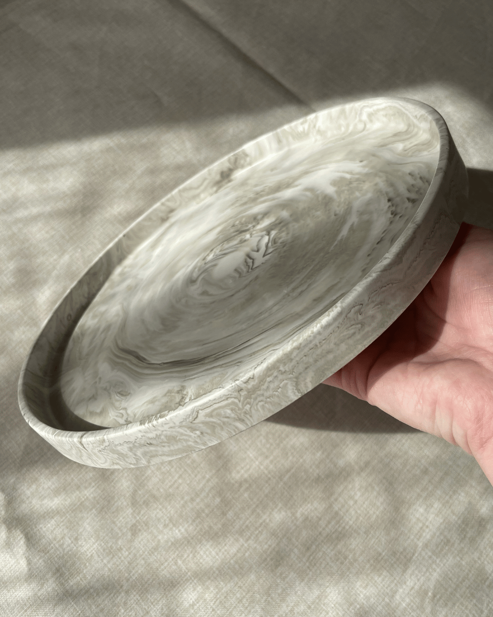 Plateau rond effet marbre, au design minimaliste et sophistiqué. Idéal pour habiller une table basse ou exposer vos plus beaux objets.