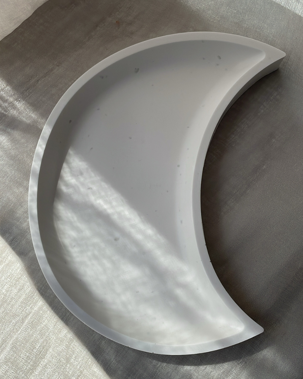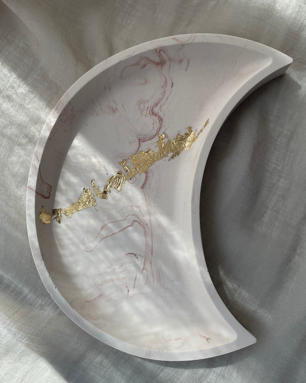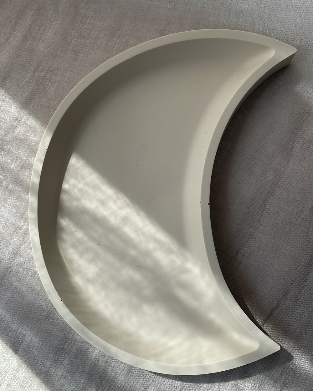 Plateau Lune en jesmonite. Un plateau fait main en forme de lune, parfait pour sublimer votre déco pendant l’Aïd ou offrir un joli cadeau.